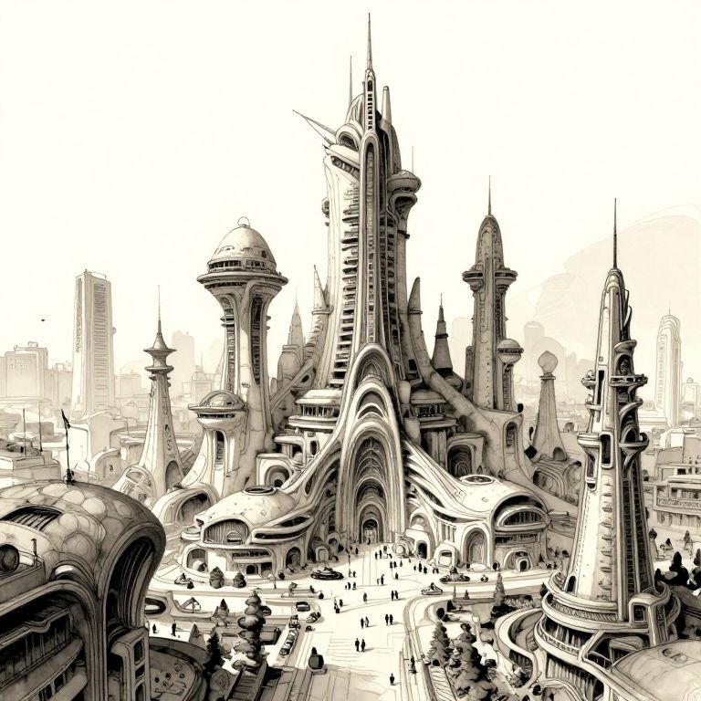 The image depicts a futuristic cityscape rendered in an ink wash style, characterized by muted, earthy tones. The scene is dominated by towering, intricately designed buildings that exhibit a blend of organic and mechanical forms. The tallest structure, centrally located, features a series of interconnected domes and spires, creating a sense of verticality and complexity. Surrounding this central edifice are numerous smaller, equally elaborate buildings, each with unique architectural elements such as curved roofs and pointed spires. The city is bustling with activity, with numerous figures and vehicles moving about, adding a dynamic element to the otherwise static structures. The overall composition is balanced, with the central building serving as a focal point, while the surrounding elements create a sense of depth and perspective. The interplay of light and shadow, achieved through the use of ink wash, enhances the three-dimensional quality of the scene, giving it a sense of realism despite its futuristic theme.