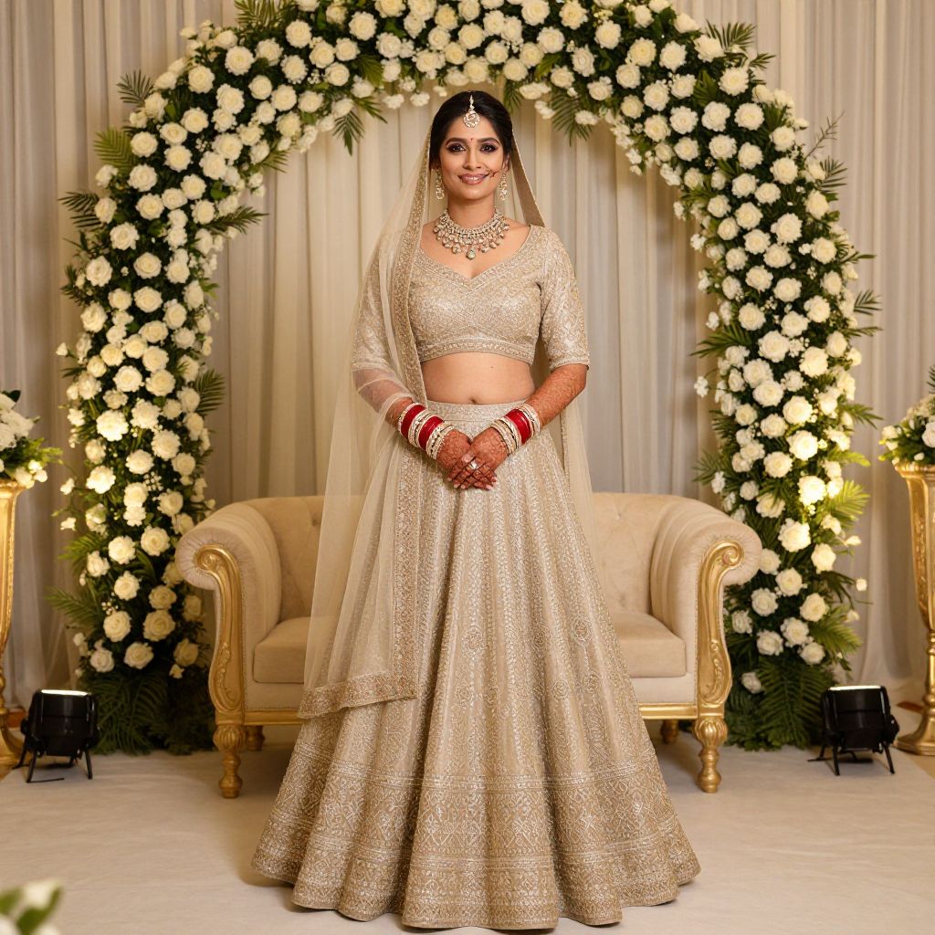 Photograph of a beautiful Indian bride in a gold embroidered lehenga and choli, standing in front of a floral arch, smiling confidently, with red