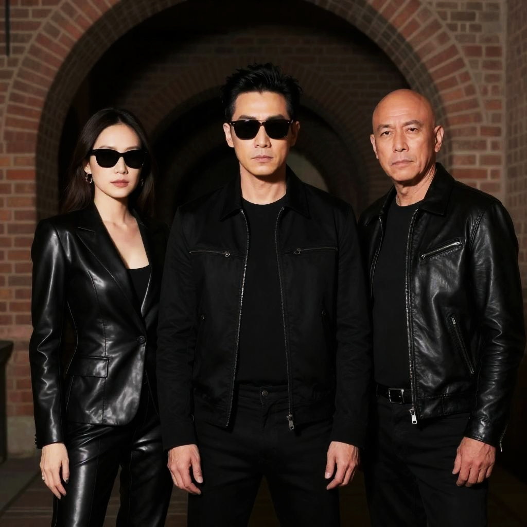 Photograph of three people standing against a green and black vertical line background. Woman on left wears white blouse and gray skirt, pregnant. Woman in center wears black latex outfit, sunglasses, hands on hips. Bald man on right wears black jacket, sunglasses, serious expression. All three have intense expressions.