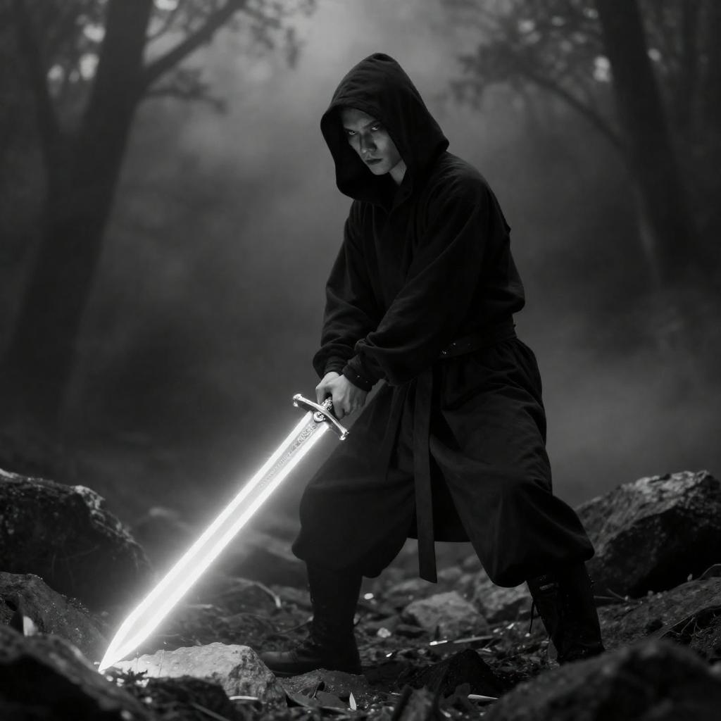 Black-and-white photograph of a hooded figure with pale skin, standing on rocky terrain, holding a glowing sword. Dark, misty forest background. Intense, focused expression. Single figure. Glowing sword emits bright light. Dense fog and shadows.