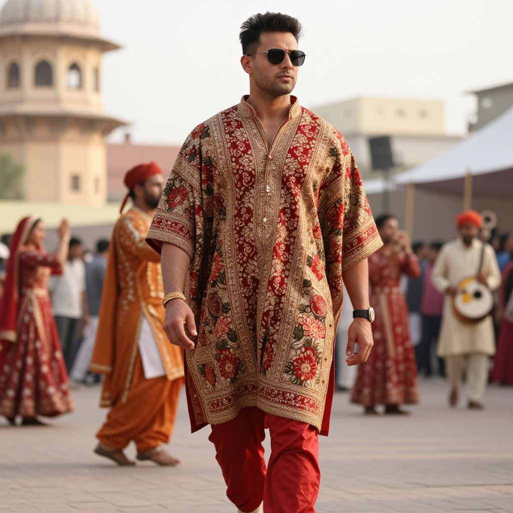A stylish Indian poncho costume adorned with intricate floral patterns and red and gold colors, worn by a tall, athletic man with a strong jawline, dark sunglasses, and a calm expression, walking through a bustling festival in Udaipur, surrounded by traditional music and dancers.