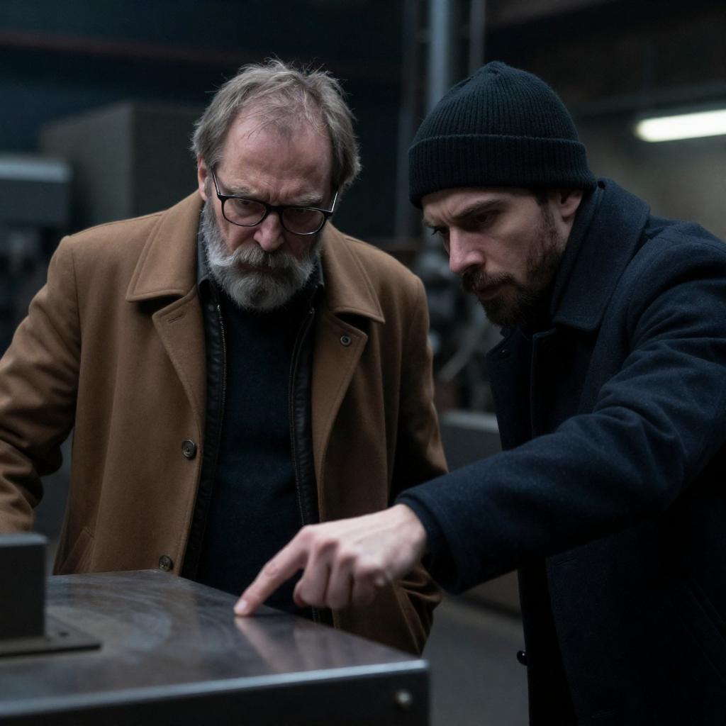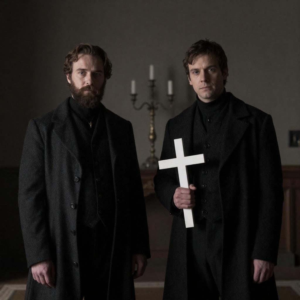 Two men in dark blue coats and black hats, holding a glowing lantern, stand close together in a dimly lit forest. The man on the left has a beard, the man on the right has gray hair. Both have focused expressions.