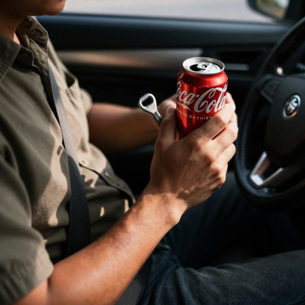 Man in Car with Coca-Cola and Can Opener