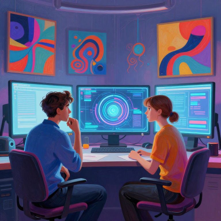 This digital artwork depicts a brightly lit, modern office with two individuals, a man in a blue shirt and a woman in an orange shirt, seated at a desk facing each other. They are engrossed in multiple computer monitors displaying colorful, abstract graphics and code. The background features three vibrant, abstract paintings with geometric shapes in red, blue, and orange. The man has short dark hair and rests his chin on his hand, while the woman has brown hair in a ponytail and holds a pen. The desk is white with a keyboard and mouse in the center. The overall style is neon, with a futuristic, digital aesthetic.