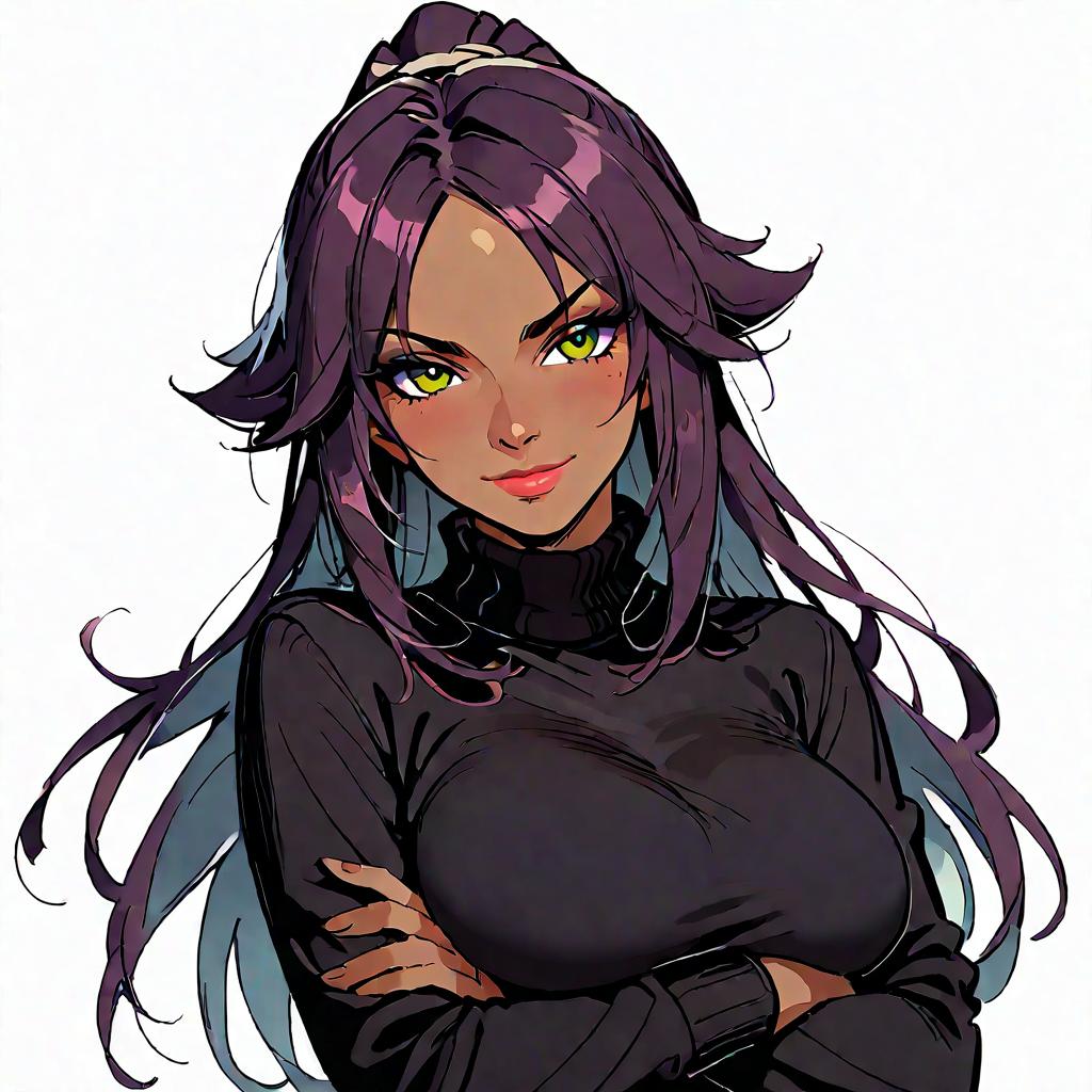 Digital anime-style portrait of a confident woman with long, purple hair, yellow eyes, and a black turtleneck sweater, arms crossed.