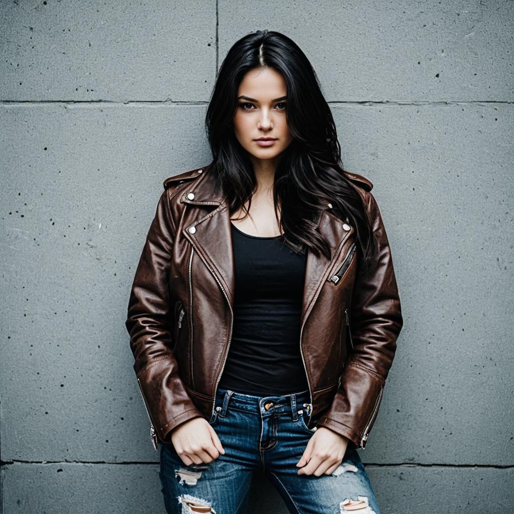 Portrait of a young woman with long dark hair standing against a cracked concrete wall. She is wearing a brown leather jacket over a white top paired with ripped blue jeans, embodying a casual cosplay style.
