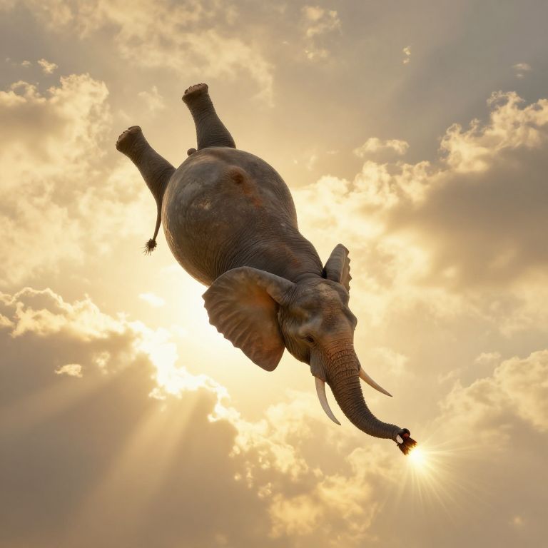 Photograph of a large elephant mid-air, sun rays shining through scattered clouds, creating a dramatic, golden halo effect around the elephant.