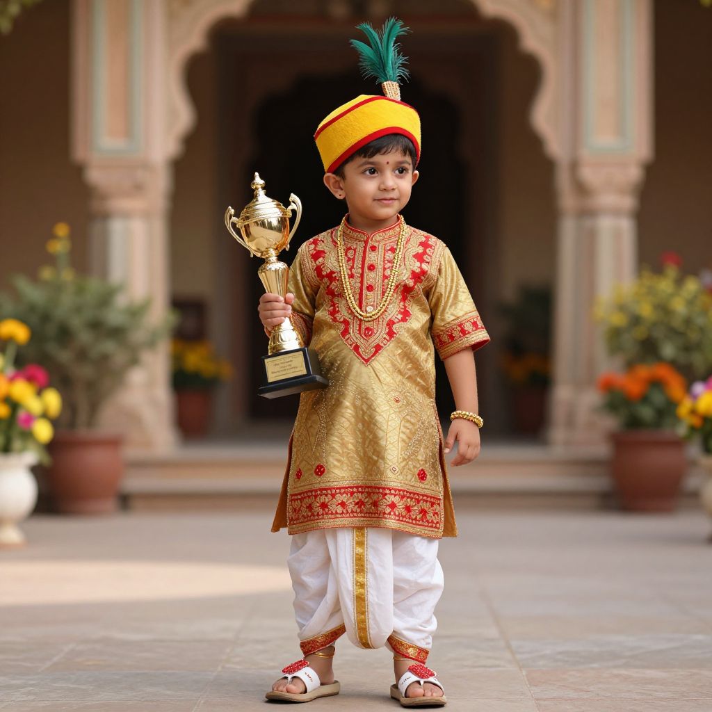 A young child, around 6 years old, is dressed in a traditional Indian outfit featuring a vibrant gold and red color scheme. The child wears a finely embroidered kurta with red and gold patterns, paired with a white dhoti that has gold trimmings. He is wearing a bright yellow and red hat with a striking green feather resting on top, adding a touch of elegance and cultural flair. In one hand, he holds a gleaming golden trophy, symbolizing achievement, while in the other, he wears a delicate gold necklace and a gold bracelet. He also wears traditional white sandals with red detailing and an additional gold bracelet on his right wrist. The scene is set in a sunny, open courtyard with soft background elements like colorful flowers and a traditional Indian archway, capturing a sense of celebration and cultural pride. The lighting is warm and natural, highlighting the rich textures and colors of the outfit and accessories.