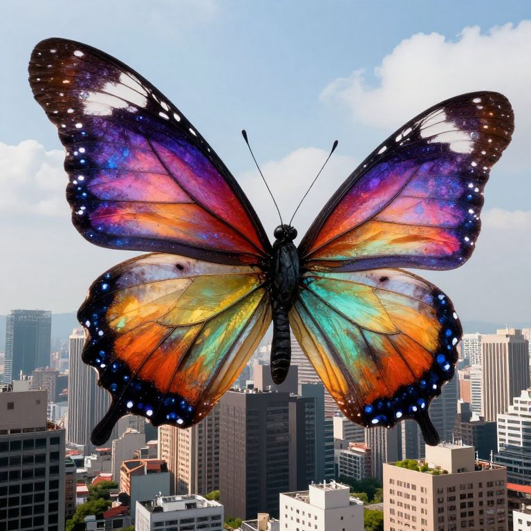 Giant, vibrant butterfly with multicolored wings (orange, blue, purple) soaring over a cityscape of tall buildings under a bright blue sky
