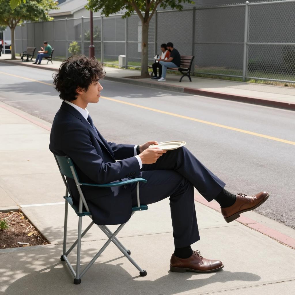 Man in dark blue suit, brown shoes, seated on folding chair on sidewalk, holding plate, sunlight casting shadows. Background: chain-link fence, trees, people sitting on benches, grey building, street with yellow line. Casual, relaxed atmosphere.