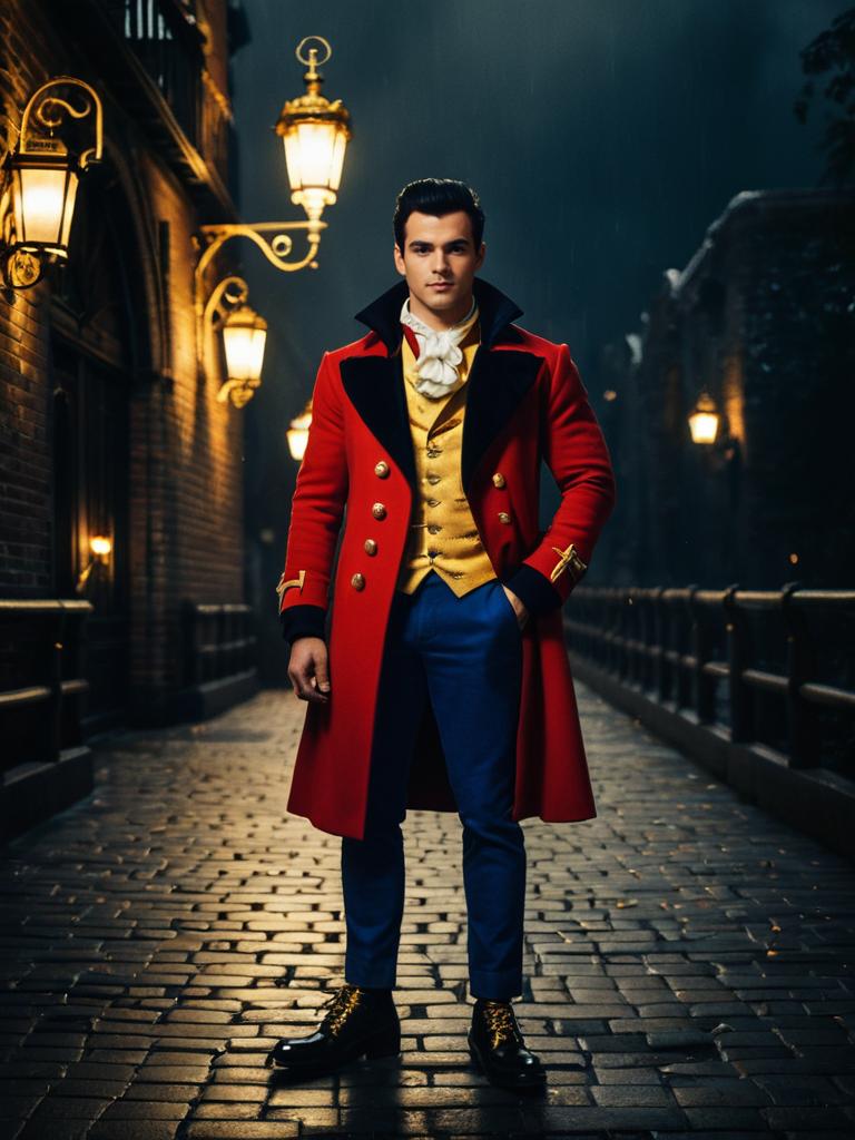 A young man wearing a vibrant red coat with black lapels, a gold waistcoat, blue pants, and black polished boots stands confidently on a cobblestone street at night. The scene is illuminated by warm street lamps attached to old brick buildings, creating a moody and elegant atmosphere reminiscent of a vintage or theatrical setting.