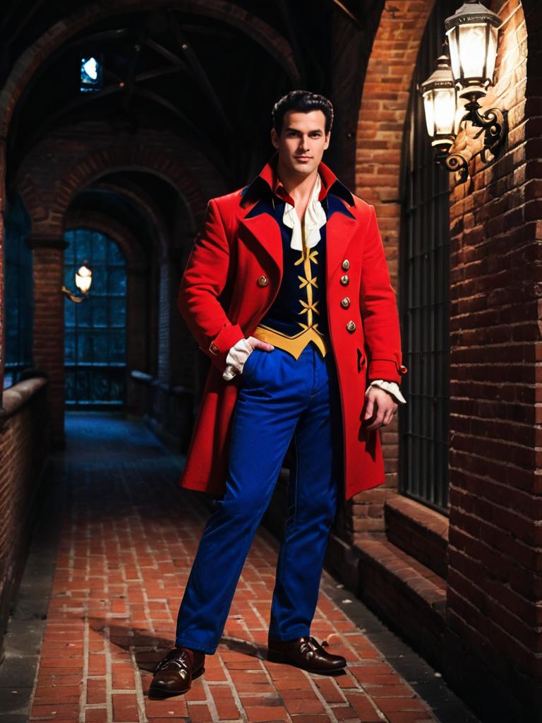 Disney Gaston, boy in red coat and blue pants standing on brick walkway --sref 1391