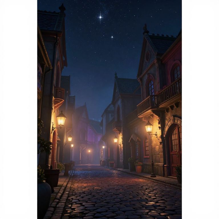 Nacht scene in a fantasy city under a starry sky, glowing lanterns casting soft light on cobblestone streets, mysterious shadows and a gentle mist creating an enchanting, mystical atmosphere, intricate architectural details and vibrant colors.