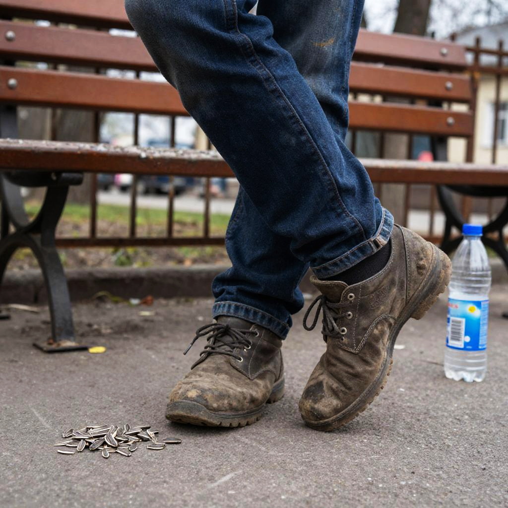 Close-up of gopnik shoes in a dynamic stance, scuffed with dirt and stains, next to sunflower seeds and a plastic bottle, set against a backdrop of gritty park benches and rusty metal fences, capturing authentic post-Soviet urban youth atmosphere.