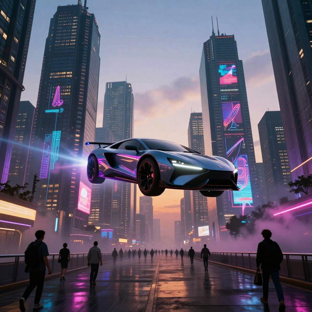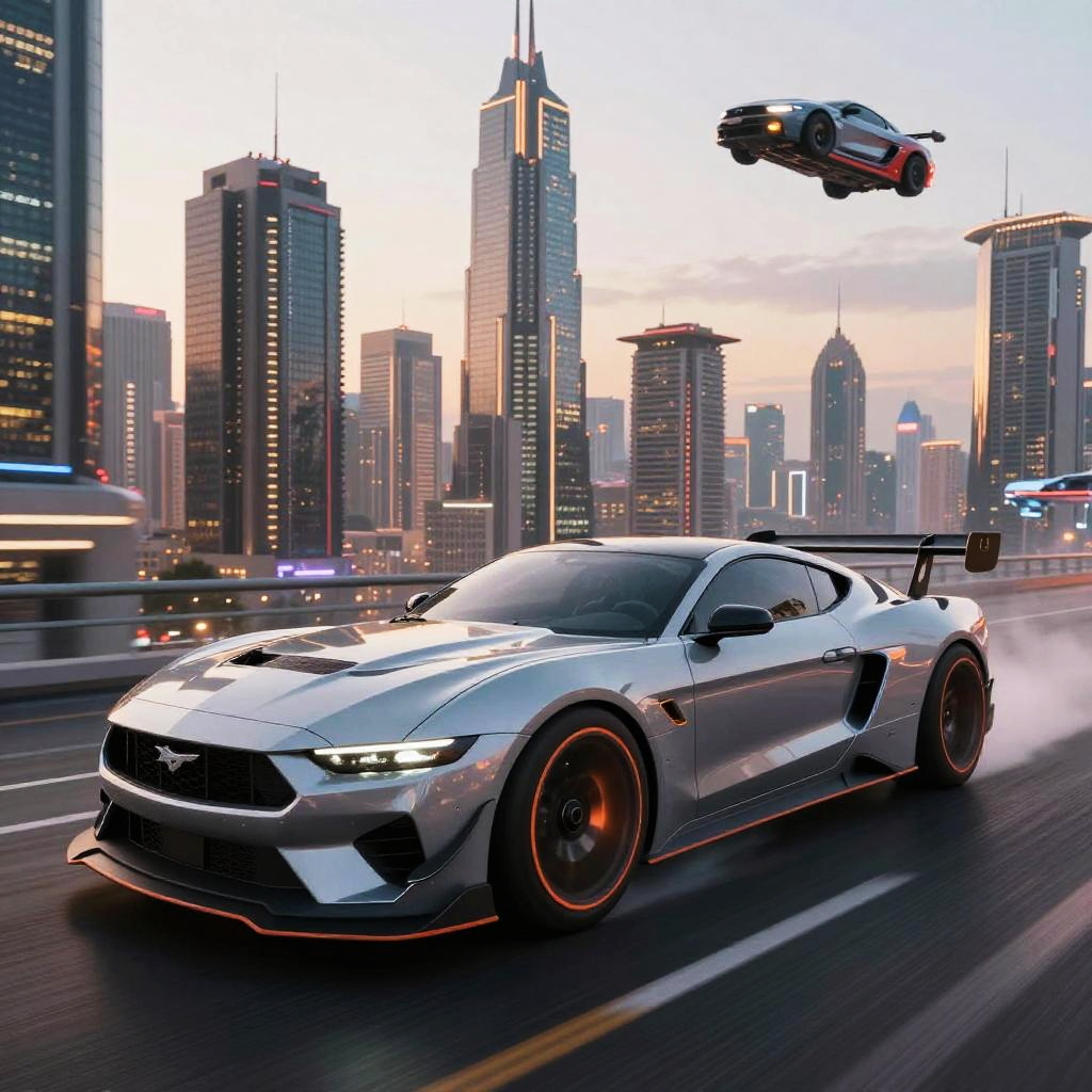 A futuristic Mustang racing through a sprawling metropolis with towering skyscrapers and flying cars overhead, futuristic design with smooth curves, neon highlights, and advanced wheel systems, immersive sci-fi atmosphere under a twilight sky