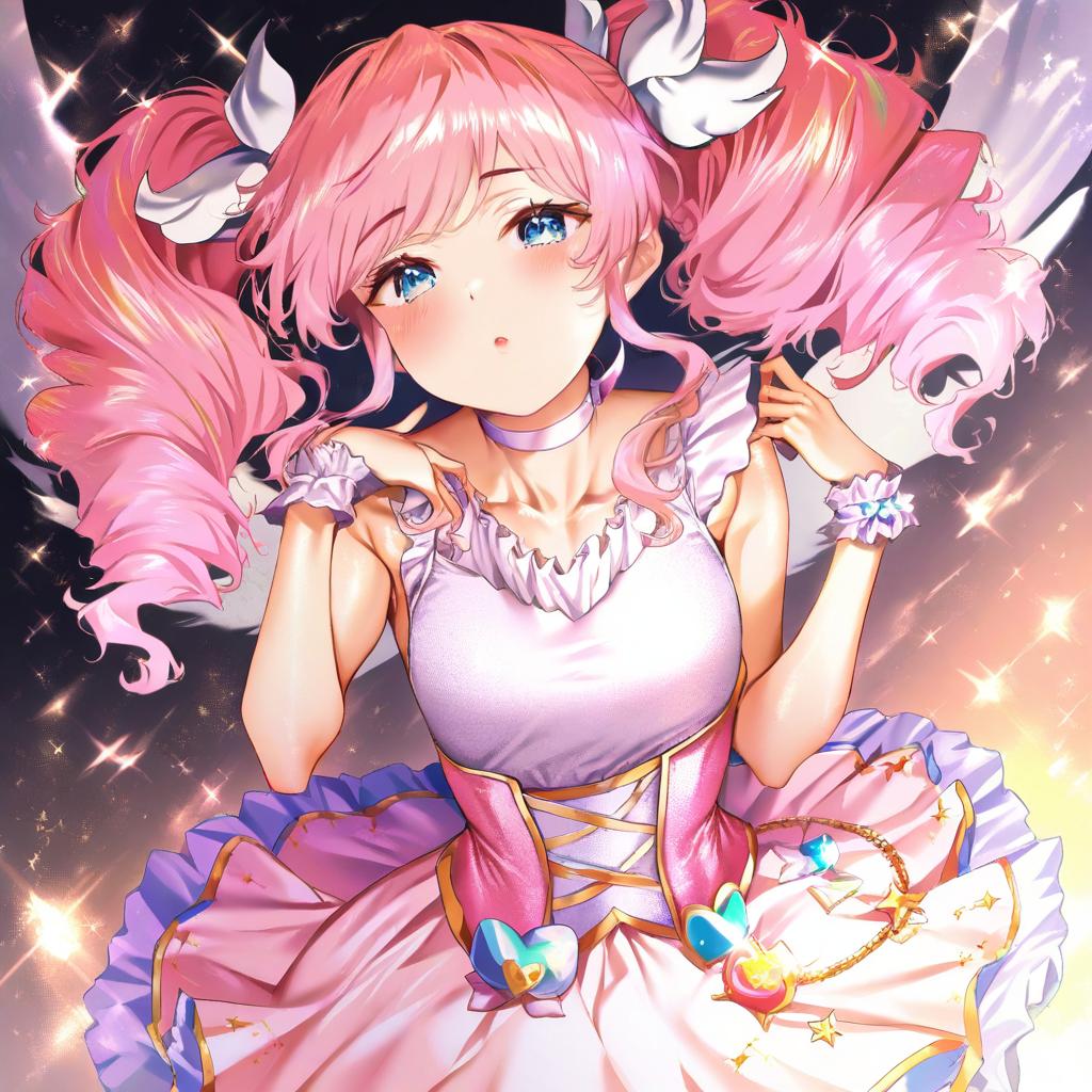 Digital anime-style illustration of a female character with long pink twintails and blue eyes. She is dressed in a detailed, frilly pink and white magical girl outfit with heart and star accessories. The background features sparkling light effects and a dark gradient, enhancing the fantasy theme. The character showcases a soft expression and a choker necklace complementing her attire.