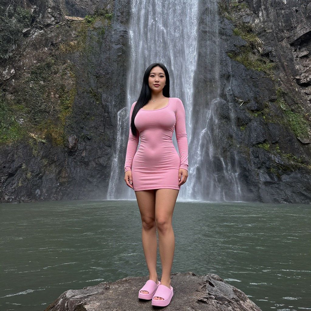 A photograph of an Asian woman standing on a rock in front of a waterfall. She has long black hair, light skin, and is wearing a tight, pink, long-sleeve mini dress that accentuates her curvy figure and medium-sized breasts. She's also wearing pink slip-on shoes. The waterfall is tall and cascades into a pool surrounded by dark, rocky cliffs and greenery.