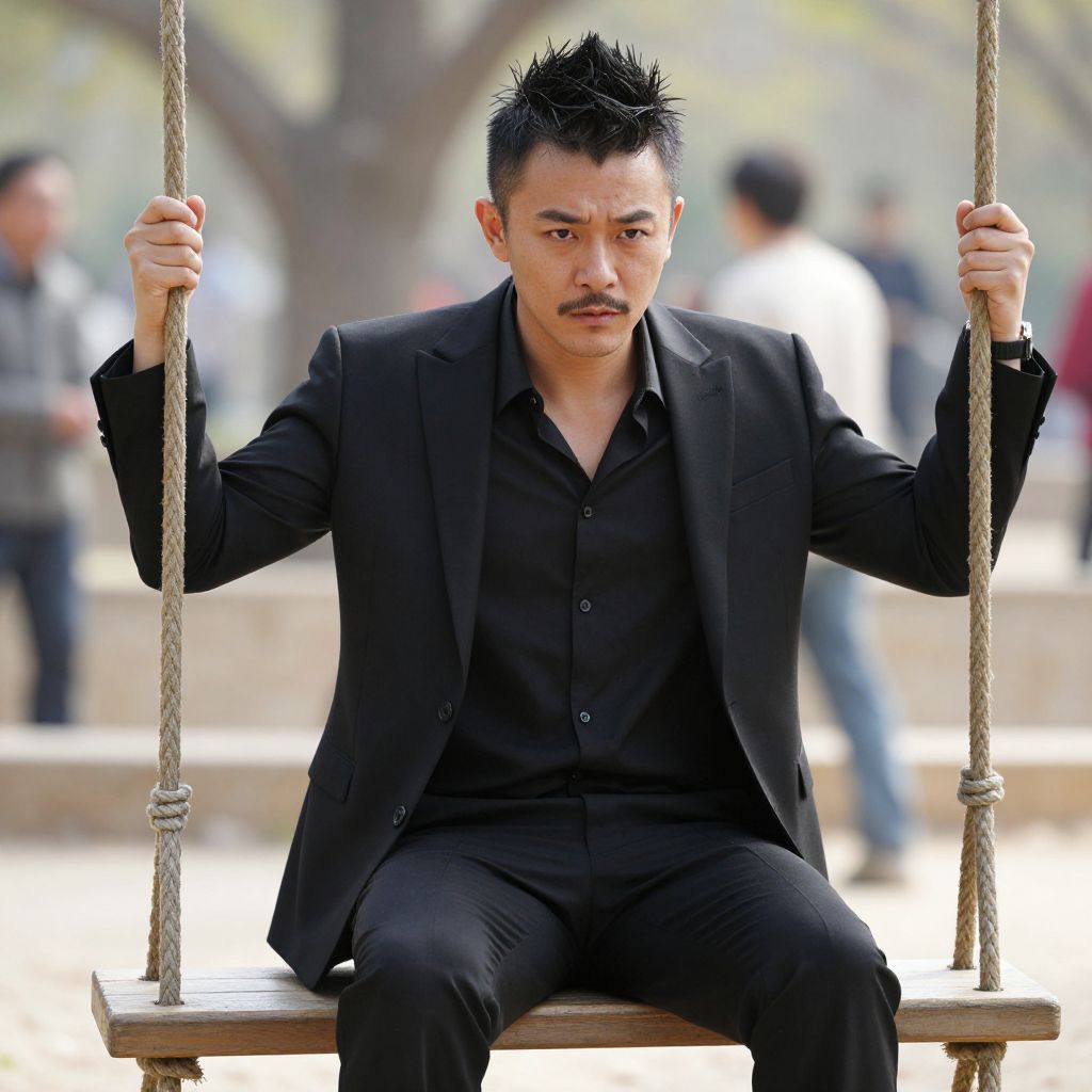 Photograph of a man with short, spiked black hair and a mustache, wearing a black suit and black shirt. He's sitting on a wooden swing with rough ropes, holding them with both hands. The background is blurred, featuring people and trees, suggesting an outdoor park setting. His expression is serious, and the overall vibe is stylish and confident.