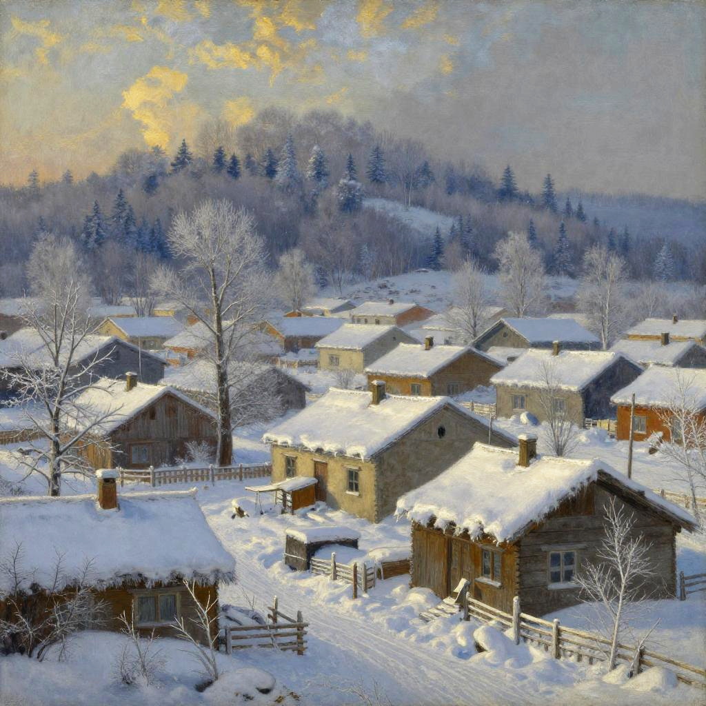 Turner-inspired Twilight Snow Village Scene