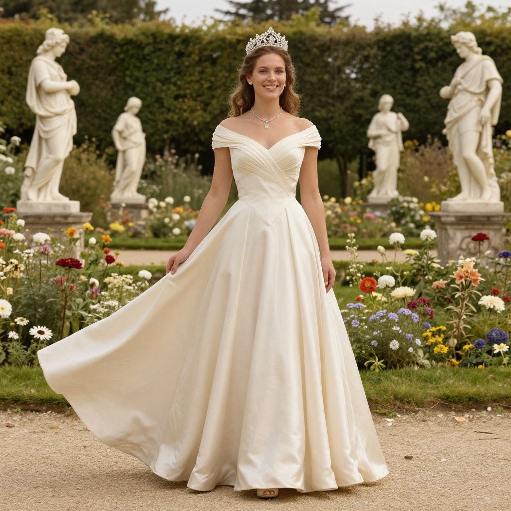 Elegant royal pose of a princess in a flowing silk gown, delicate tiara sparkling, standing in a lush royal garden with blooming flowers and marble statues, warm natural light