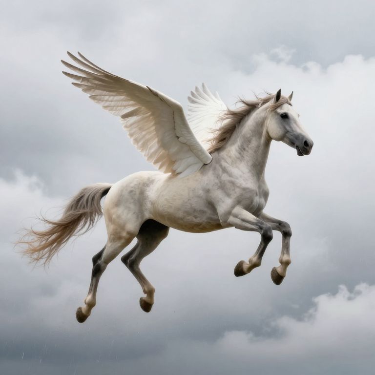 In the ethereal expanse of a cloud-draped sky, a winged horse gallops with a grace that transcends gravity, embodying the boundless spirit of freedom and the quiet promise of dreams carried on whispers of wind and the faint scent of rain.