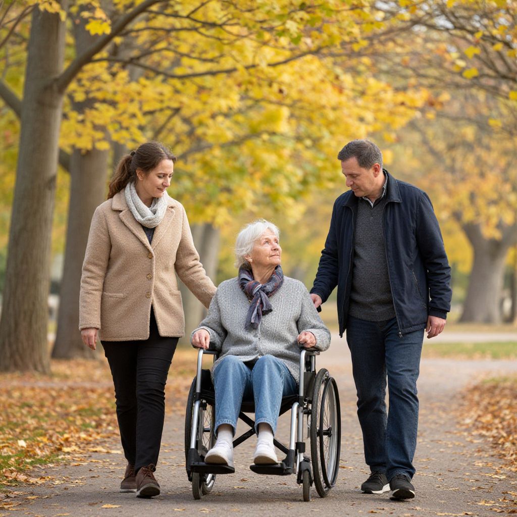 Photograph of an elderly woman in a wheelchair, accompanied by a young woman and man, walking on a leafy autumn path.