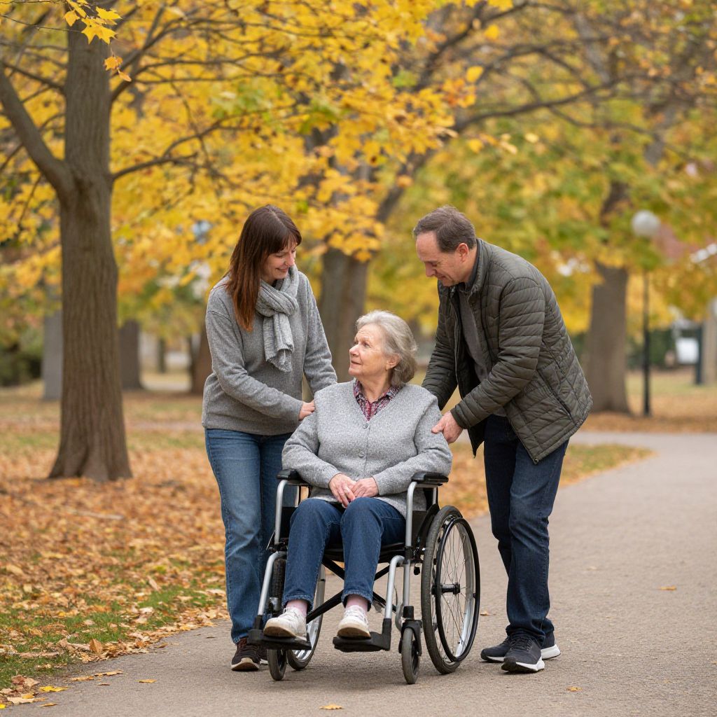 Caregivers assist an elderly woman in a wheelchair during a serene autumn walk through a park, surrounded by vibrant foliage and fallen leaves.
