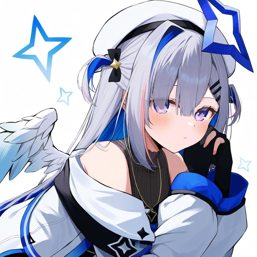 Amane kanata (work), hololive, 1girl, angel wings, angel, angel wings, purple eyes, hair over one eye, blue hair, grey hair, colored inner hair, single hair intake, official alternate hairstyle, long hair, official alternate hair length, streaked hair, pink hair, asymmetrical bangs, two side up, hairclip, black gloves, partially fingerless gloves, white jacket, black dress, white headwear, star halo, virtual youtuber, virtual youtuber, feathered wings, white wings, mini wings, feathered wings, white wings, mini wings, beret, by artist totoki86, animagine