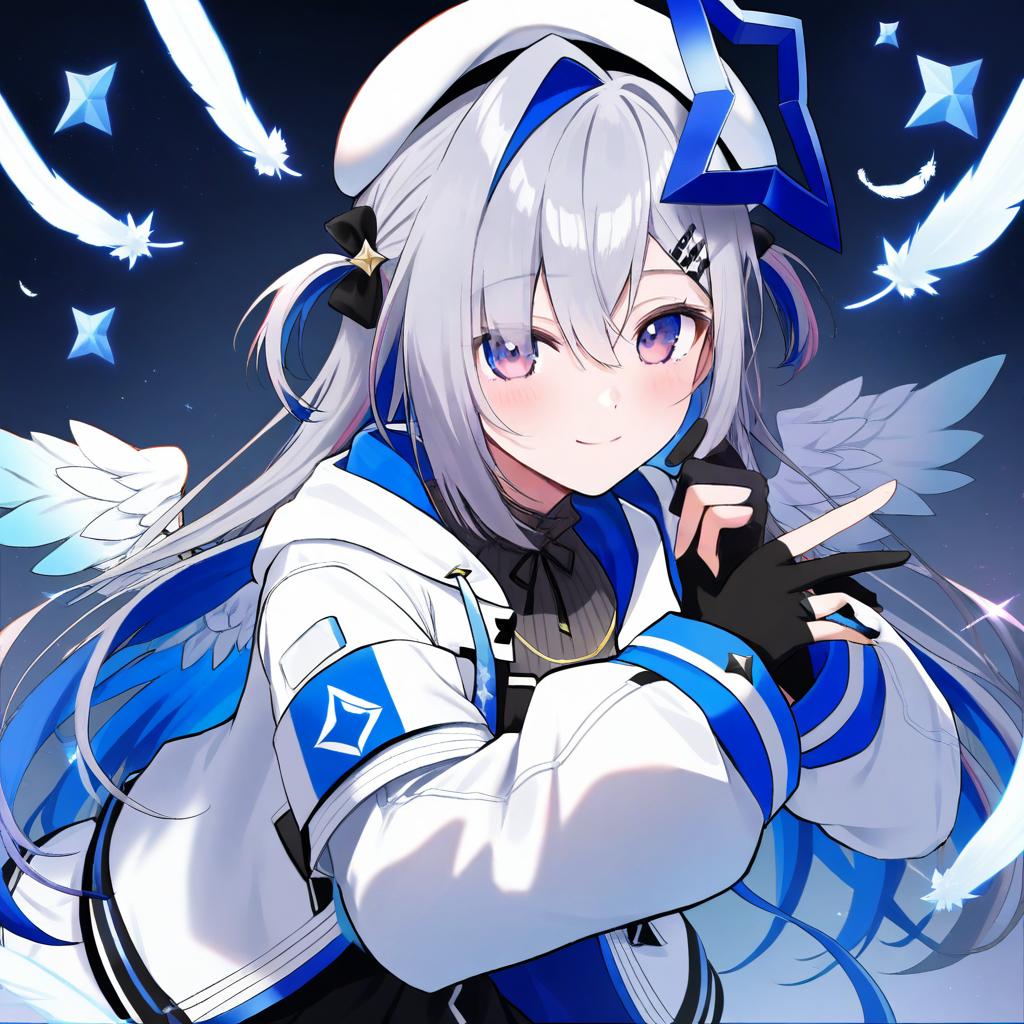 Digital illustration of an anime-style girl with long blue and grey streaked hair, purple eyes, and angel wings. She wears a white jacket with blue accents, a black dress, a white beret with a blue star, and black partially fingerless gloves. The character has a star halo and scattered white feathers in the background, set against a twilight sky with glowing light effects.