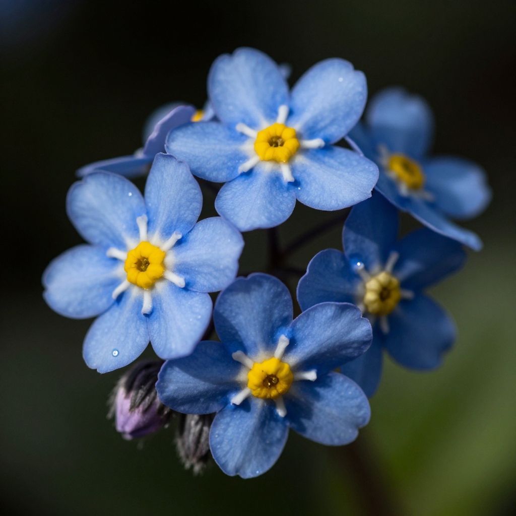 ((extremally close shoot)) (macro shoot), Forget-Me-Not (Myosotis sylvatica): A small, sky-blue flower with five petals and a bright yellow center. , realistic, ((photorealistic)), extremely detailed, glass reflection, dark shadows, hard light hard shadows, shallow depth of field, highly detailed, high budget Hollywood film, ((darkfull )), detailed, focus on material