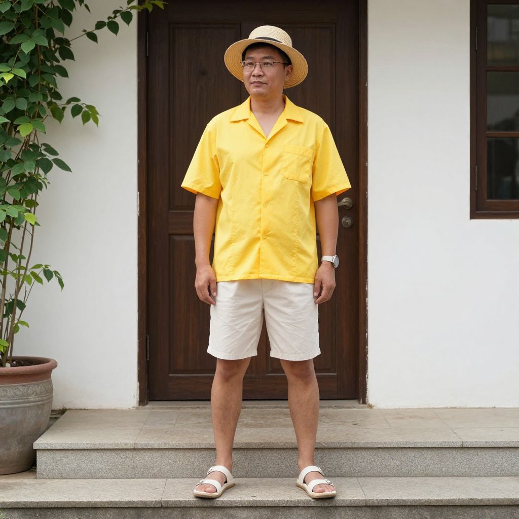 Photograph of an Asian man standing on a concrete porch in front of a dark wooden door with a potted plant to the left. He is wearing a bright yellow short-sleeve shirt, white knee-length shorts, white sandals, and a straw hat. He has glasses, a watch on his left wrist, and a neutral expression. The background features a white wall with a small window to the right of the door. The image has a vibrant, sunny feel with strong contrasts between the yellow shirt and the dark door.