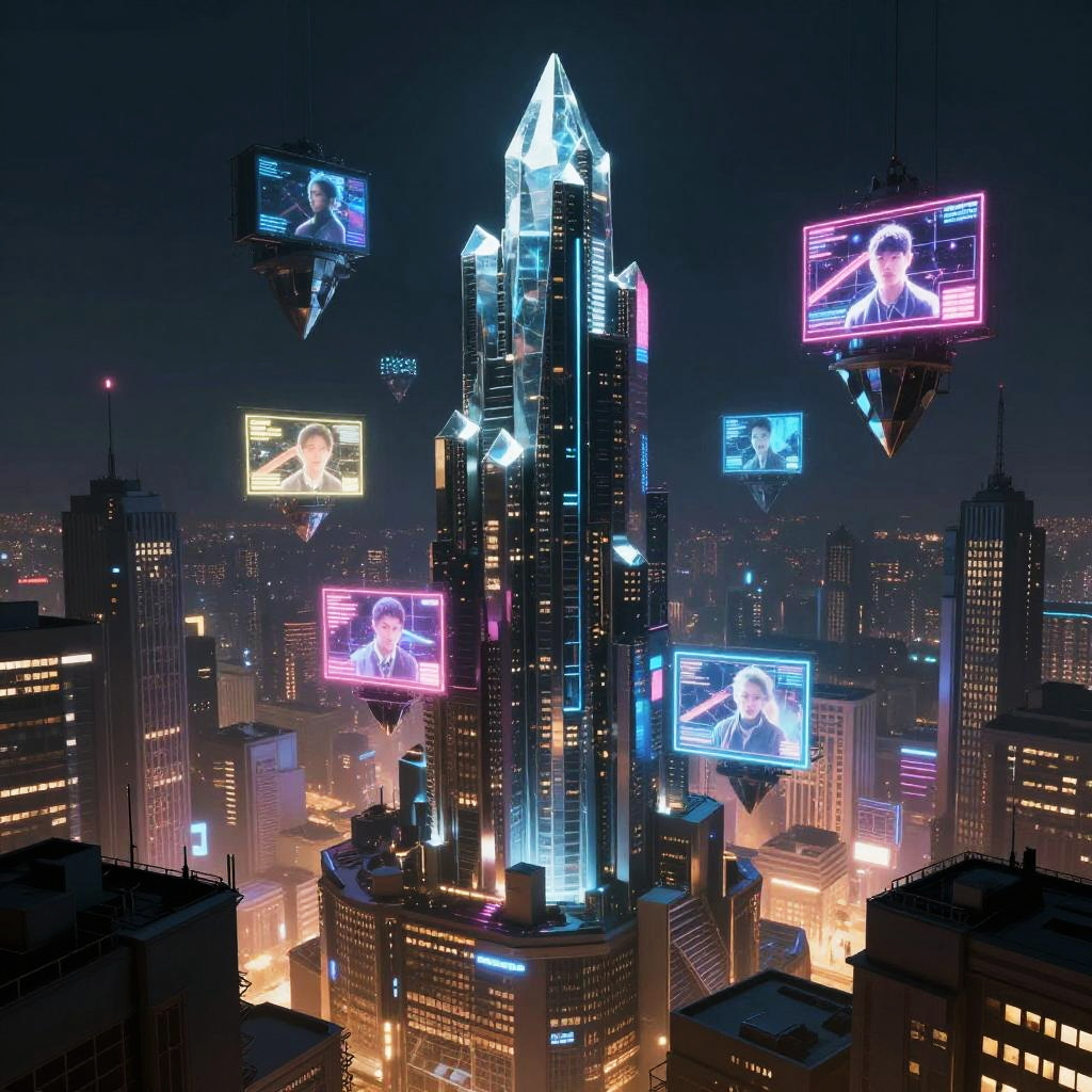 Cyberpunk Cityscape with Floating Crystals