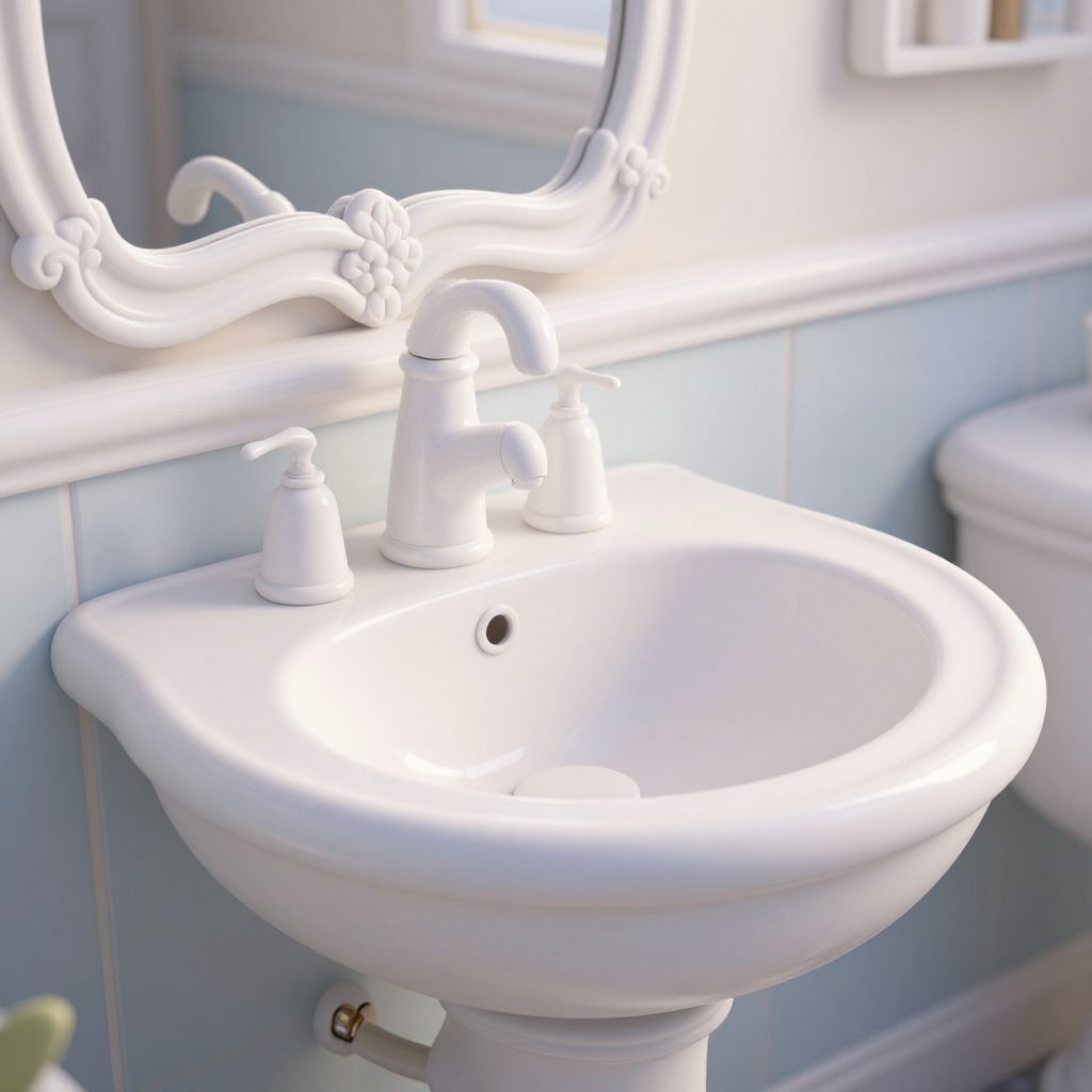 Photograph of a white ceramic sink with a classic, vintage design, featuring an oval basin and a curved, ornate faucet with a soap dispenser on the right. The sink is mounted on a light blue tiled wall with white trim. Above the sink is a large, white-framed mirror with intricate carvings. In the background, a white toilet is partially visible. The lighting is bright, highlighting the smooth, glossy texture of the sink and tiles. The overall style is traditional and elegant, with a focus on simplicity and clean lines.