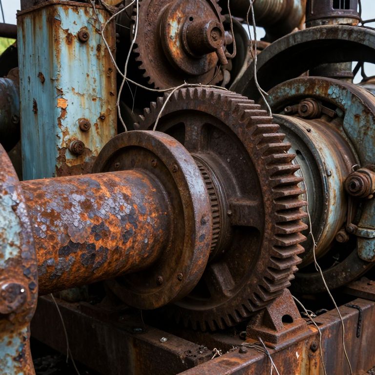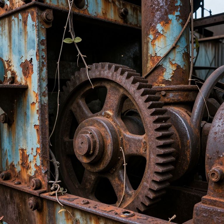 A detailed view of abandoned industrial machinery being reclaimed by nature, Flaking rust patterns, vines weaving through gears, peeling paint, textures of metal and decay, shafts of light highlighting textures, extreme close-up, gritty, atmospheric light