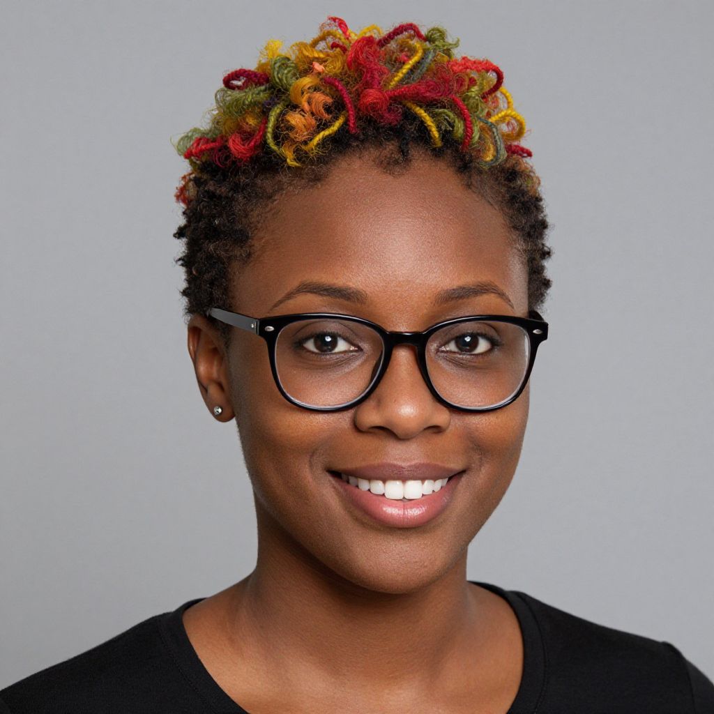 Woman with dreadlocks wearing a red, white, and blue hat and a red and white striped jacket with a red bow tie.