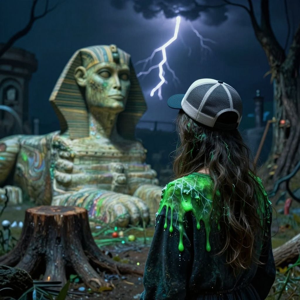 1girl, (whimsical art by Alfred Kubin:1.2) and (Tom Roberts:0.9) and (Jan van Ravesteyn:1.3), dark Cinematic still, Rule of Thirds, rear angle of a Primordial Brutal ([Bluebird:chutney:3]:1.3) wearing a Trucker hat, near Grouchy Sphinx, crowded dungeon with Tree stump, Thunderstorm, shallow depth of field, Detailed illustration, Horror, Academism, soft light, Depth of field 270mm, Velvia, triadic, dripping electric green and dark blue, UHD, High quality