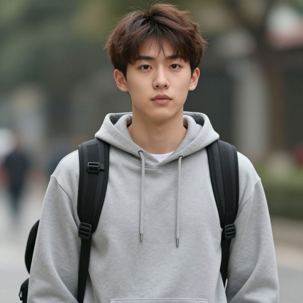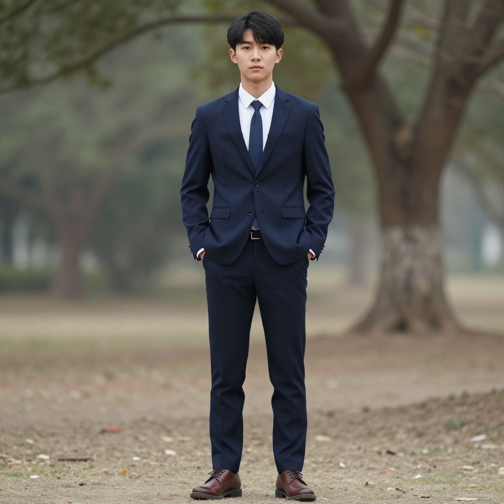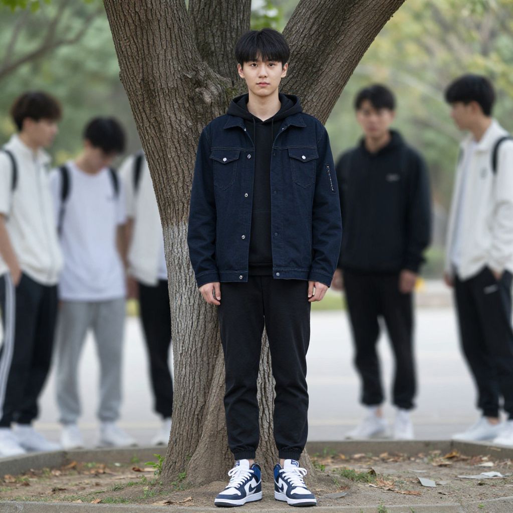 Photograph of an Asian teenage boy in black jacket and pants, standing against a tree, with blurred background of similarly dressed boys.