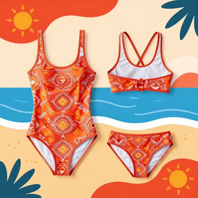 Colorful digital illustration of a vibrant red and orange patterned one-piece swimsuit and bikini top, set against a beach background with blue waves and bright