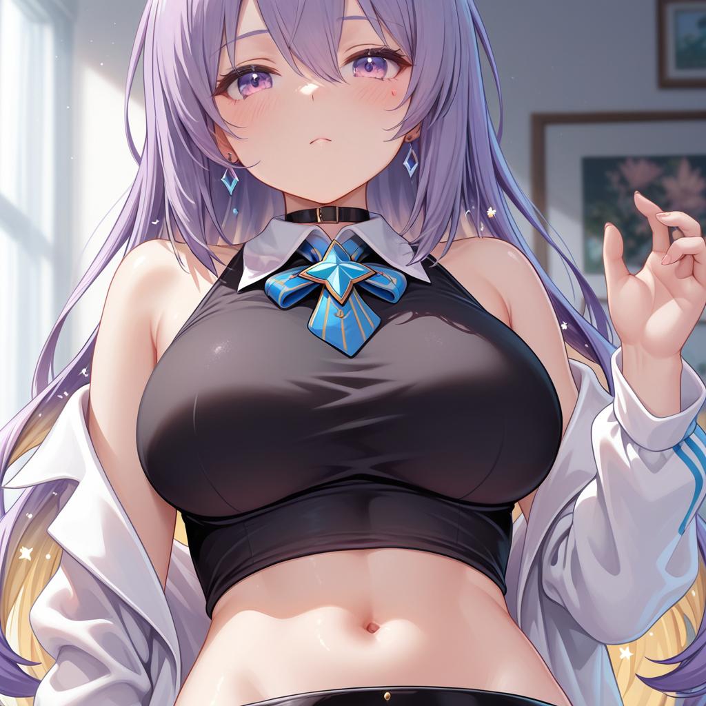 Moona hoshinova (1st costume), hololive, 1girl, purple eyes, hair between eyes, purple hair, starry hair, colored inner hair, blonde hair, long hair, gradient hair, two-tone hair, very long hair, large breasts, navel, white jacket, black shirt, sleeveless shirt, off shoulder, black choker, bare shoulders, virtual youtuber, virtual youtuber, crop top, star (symbol), midriff, by artist milkshakework, dark_illustrious