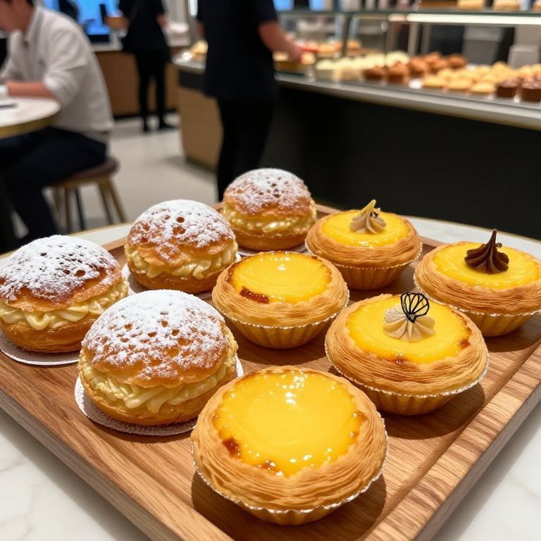 Wooden tray showcasing six delectable pastries, including two powdered sugar-topped facturas and four golden-brown tarts with yellow fillings and decorative toppings, set against a bustling café background.