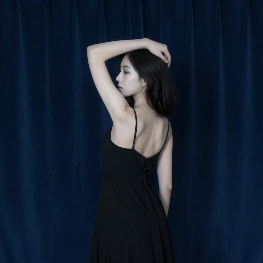 Portrait of a woman with pale skin and dark hair wearing a black, flowing dress. She is standing in front of tall, wavy dark blue curtains, posing with her right arm raised and hand resting on the back of her head. The lighting softly illuminates her profile in a minimalist studio setting.
