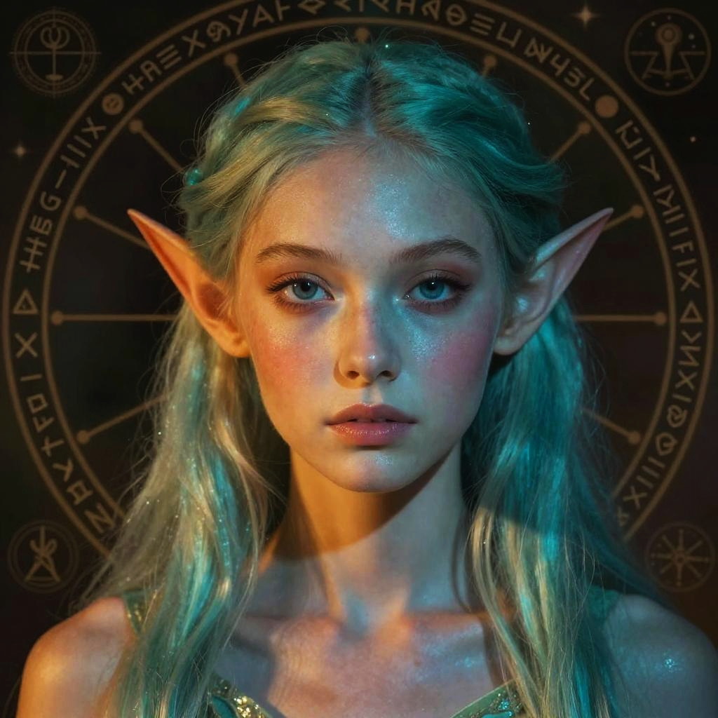 Portrait of a changeling exhibiting radiant skin color transitions from warm amber to cool aqua, blending fantasy with subtle bioluminescent textures, framed by ancient runes and mystic symbols.