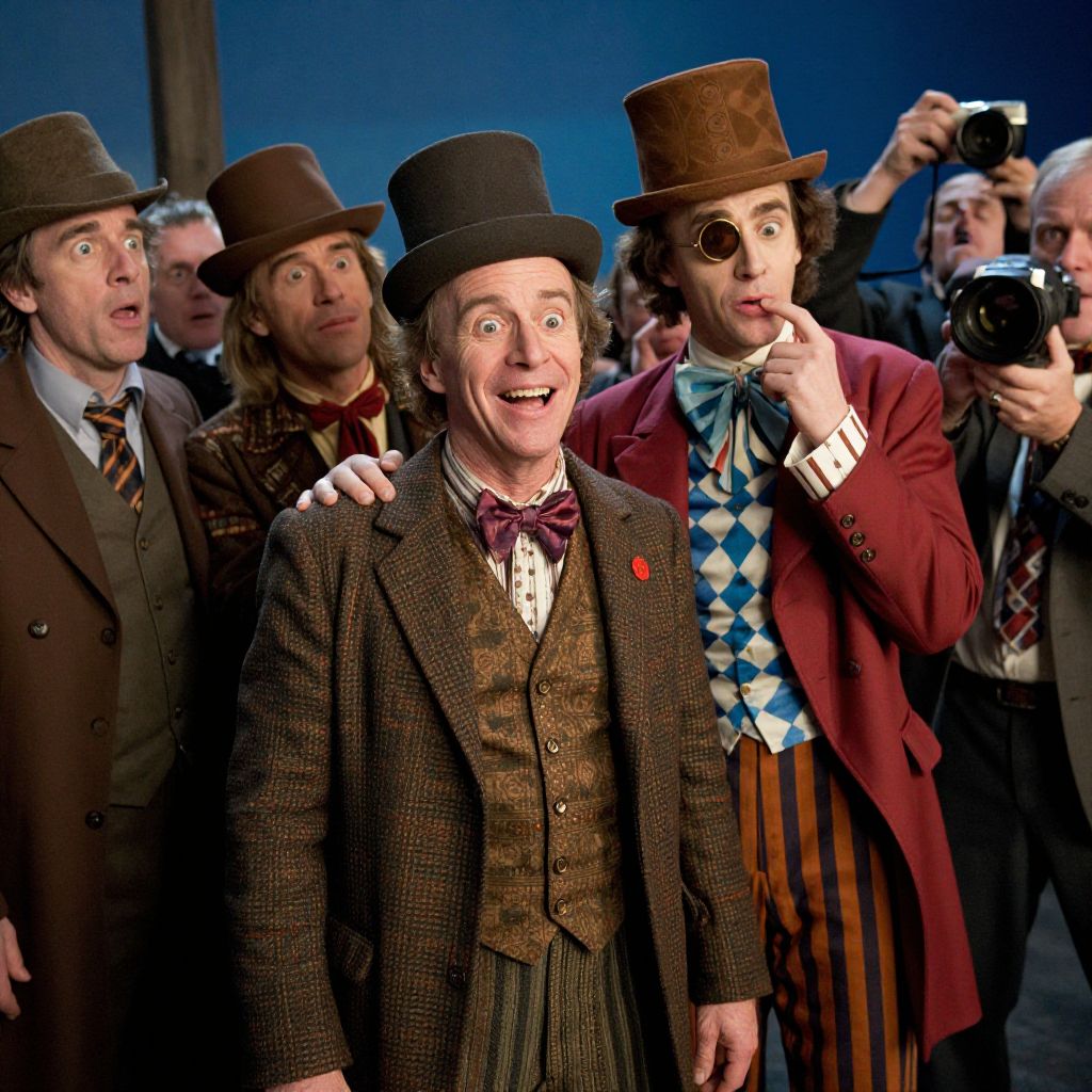 Bill murray, goofy smile, he is the leader of the rag tag misfit group, northwest coast gloom light, he is in disbelief when his doppelganger arrives, who is this man, monocle, willy wonka - style outfit, paparazzi photo