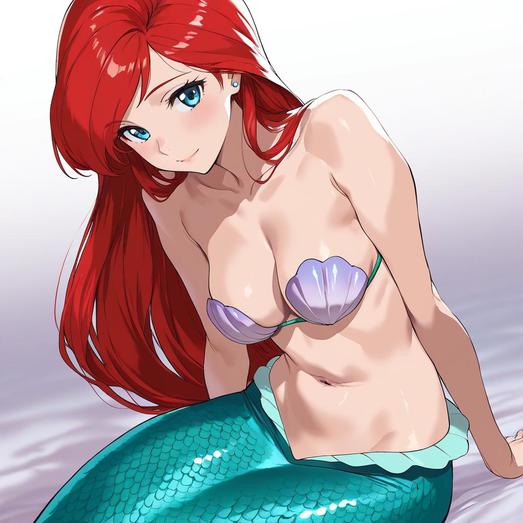 Ariel (disney), the little mermaid, 1girl, red lips, blue eyes, red hair, long hair, medium breasts, navel, shell bikini, mermaid, by artist ugume, animagine