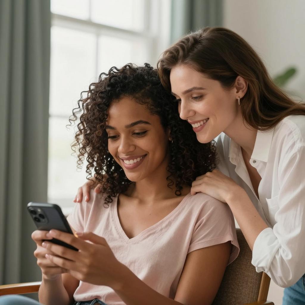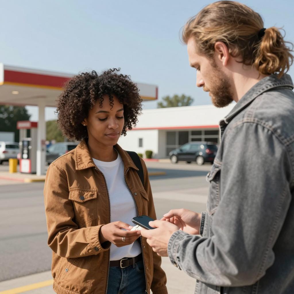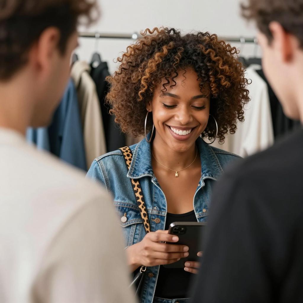 Photograph of a smiling Black woman with curly brown hair, large silver hoop earrings, and denim jacket. She holds a black purse with a leopard print strap. A man with short dark hair stands in front of her, partially out of frame. Background includes clothing racks with various shirts. Woman's eyes are downcast, smiling widely.