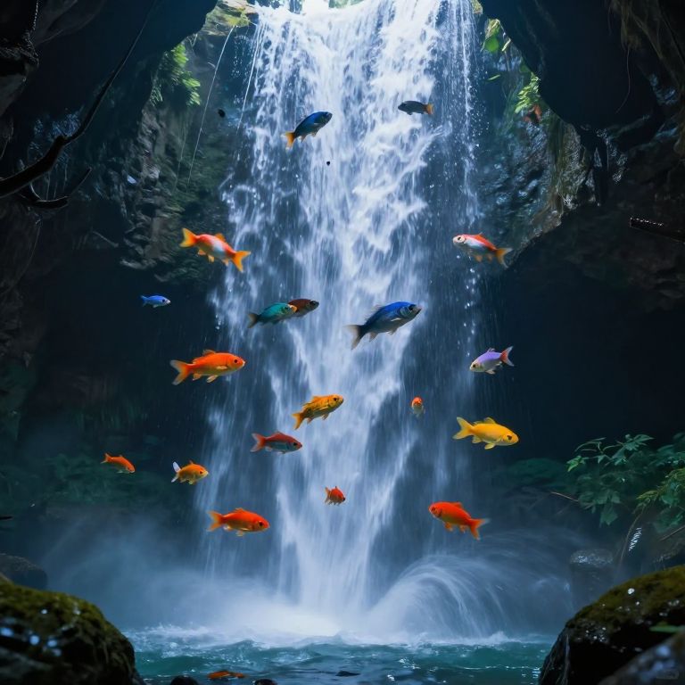 Vividly colored fish defy gravity, gracefully ascending a luminous waterfall that cascades into a serene, otherworldly cavern where light and shadow blend seamlessly.