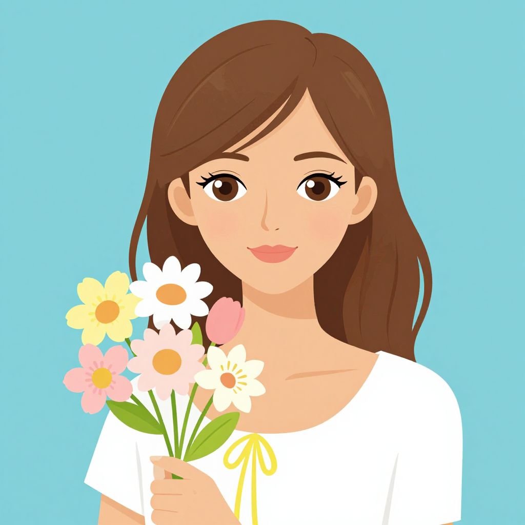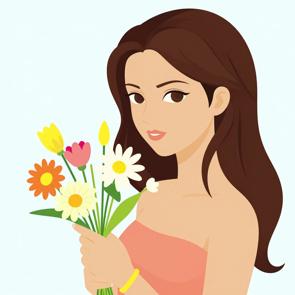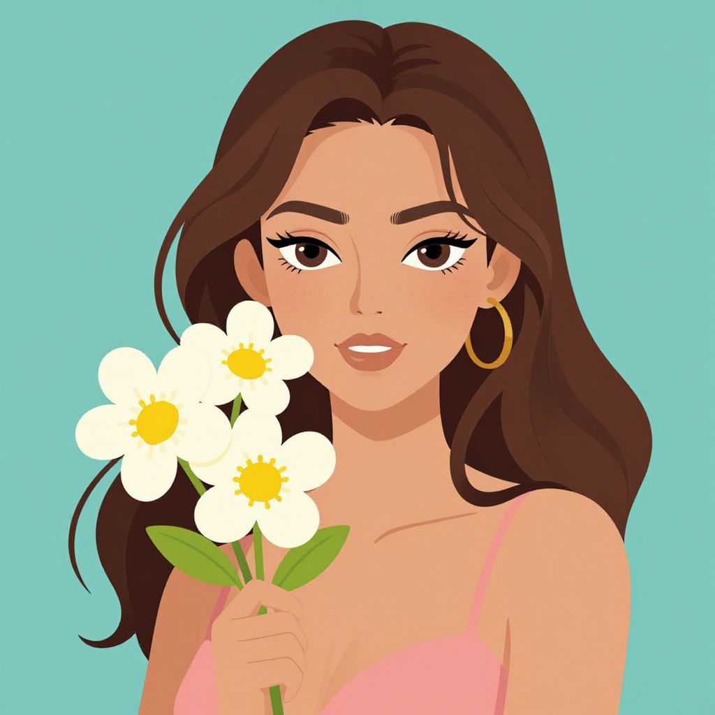 Digital illustration of a smiling woman with long brown hair, holding white daisies, wearing a pink dress and gold hoop earrings, against a light blue