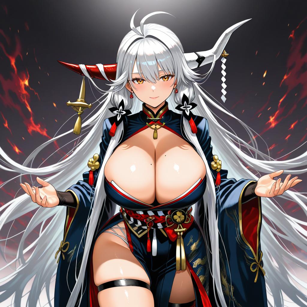 Digital anime illustration of a female warrior with white and grey long hair adorned with asymmetrical red and white horns. She has grey eyes, large breasts, and wears an intricate dark blue kimono-style outfit with red and gold detailing, thigh strap, and ornamental accessories. The background is dark with fiery embers, emphasizing her commanding presence.
