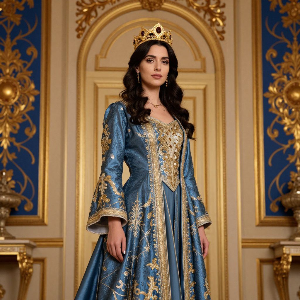 Regal Woman in Ornate Blue and Gold Gown