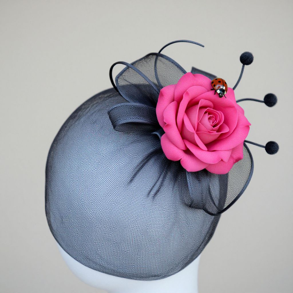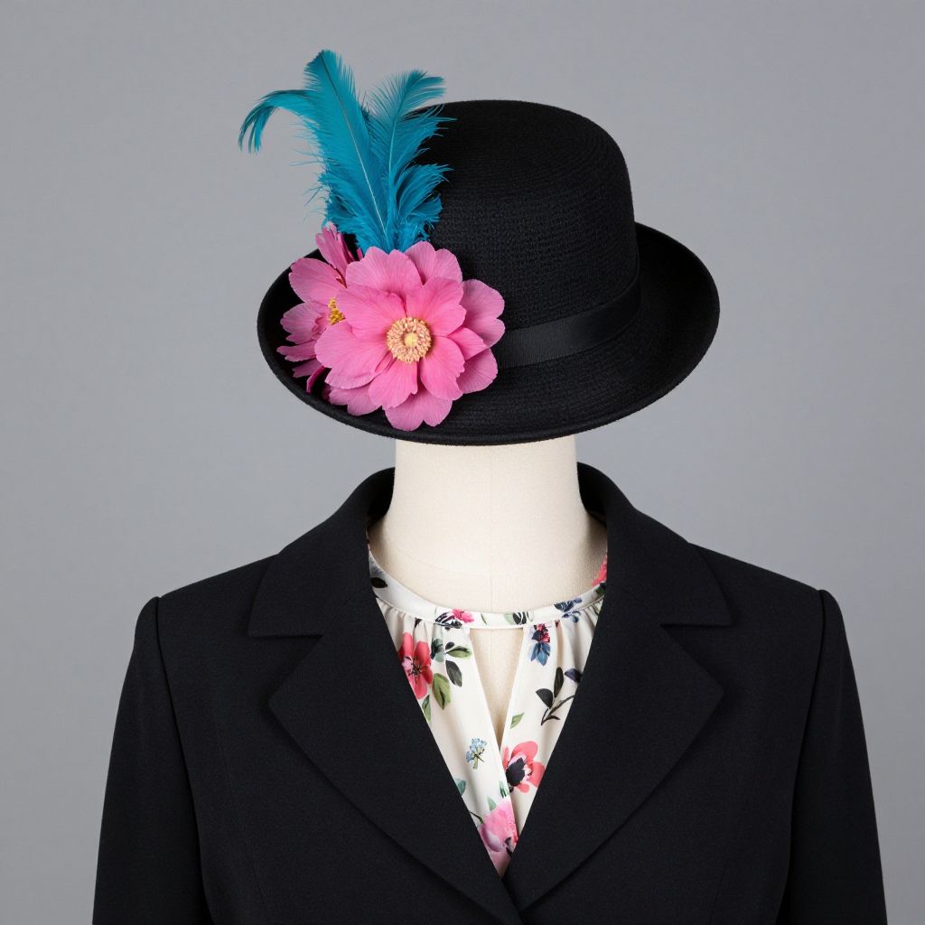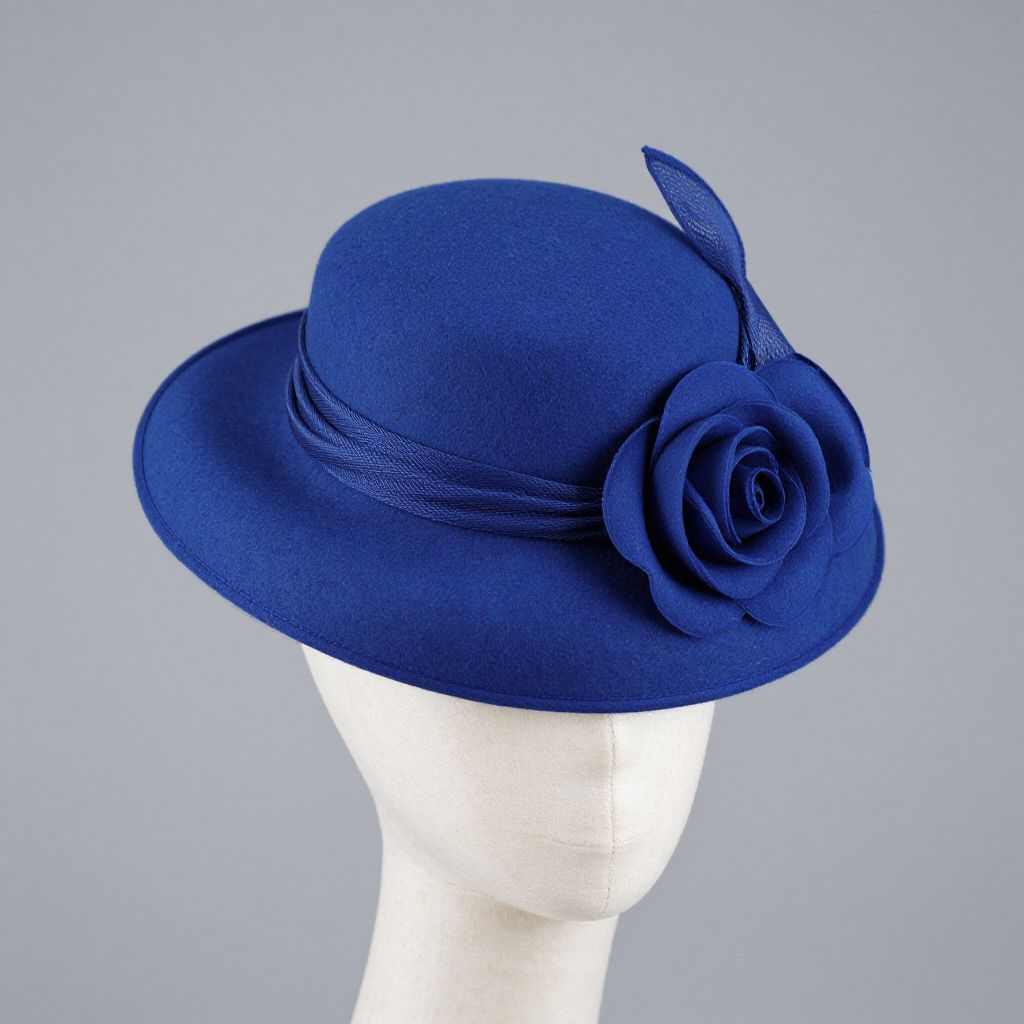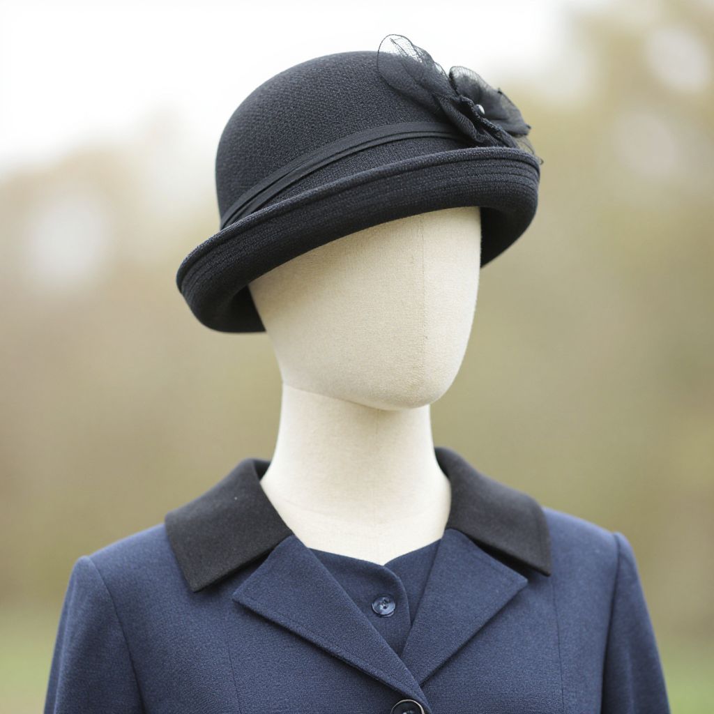 Elegant navy-blue Edwardian-style tea hat featuring a wide brim, a central black netted flower embellishment, and a delicate ribbon accent, showcased on a mannequin head against a neutral background.